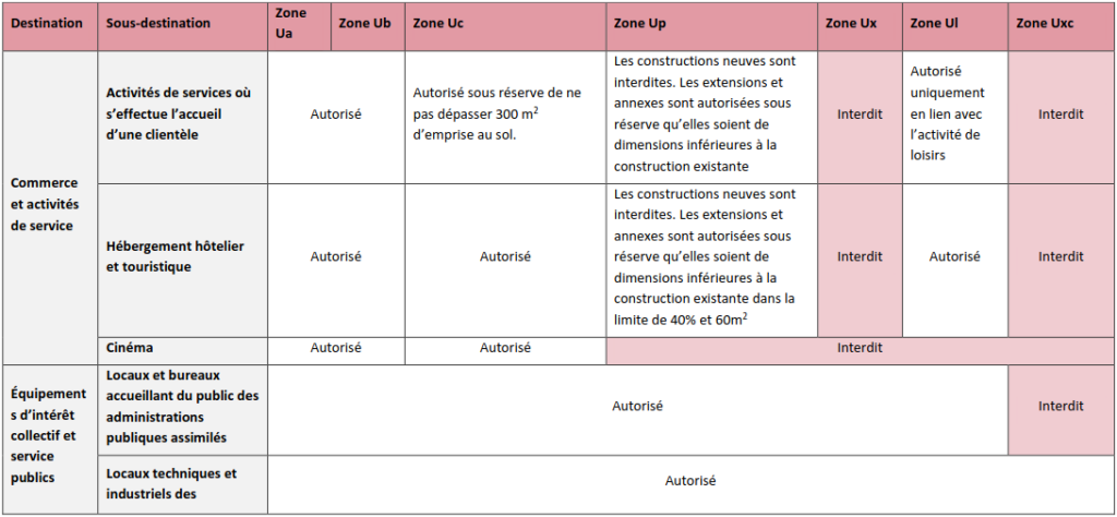 - la destination « commerce et activités de service » est autorisée en Uc, mais avec une limite stricte de surface : pour les activités de services accueillant une clientèle, la construction est « autorisée sous réserve de ne pas dépasser 300 m² d’emprise au sol » ;